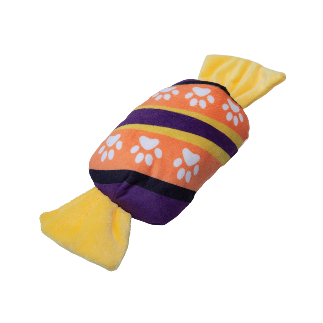 Trick or Treat! This toy will be your dogs favorites Halloween treat. Toy contains crinkle and squeak. Made from recycled water bottles.