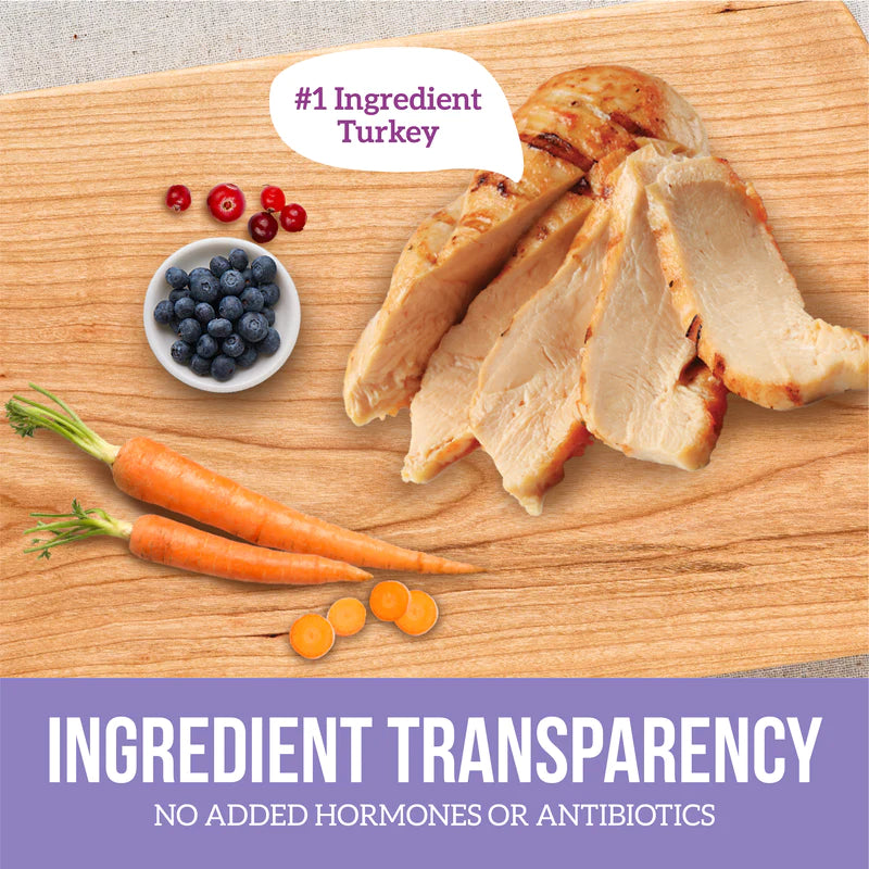 Turkey, Chicken Broth, Chicken, Dried Chickpeas, Carrots, Dicalcium Phosphate, Cranberries, Blueberries, Potassium Chloride, Agar-Agar, Guar Gum, Natural Flavor, Minerals (Zinc Proteinate, Iron Proteinate, Copper Proteinate, Manganese Proteinate, Sodium Selenite, Cobalt Proteinate, Potassium Iodide), Dried Kale, Vitamins (Vitamin E Supplement, Thiamine Mononitrate, Niacin Supplement, d-Calcium Pantothenate, Vitamin A Supplement, Riboflavin Supplement, Biotin, Vitamin B12 Supplement, Pyridoxine Hydrochloride, Vitamin D3 Supplement, Folic Acid), Magnesium Sulfate, Choline Chloride, Coconut Oil, Menhaden Fish Oil (Preserved With Mixed Tocopherols), Sodium Carbonate.