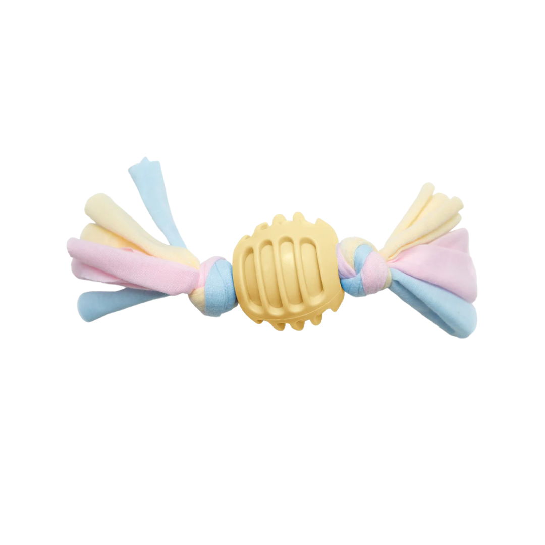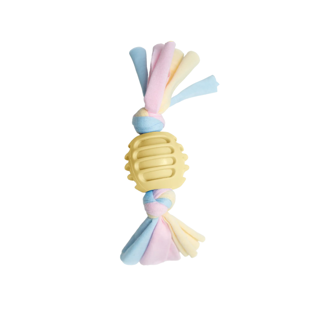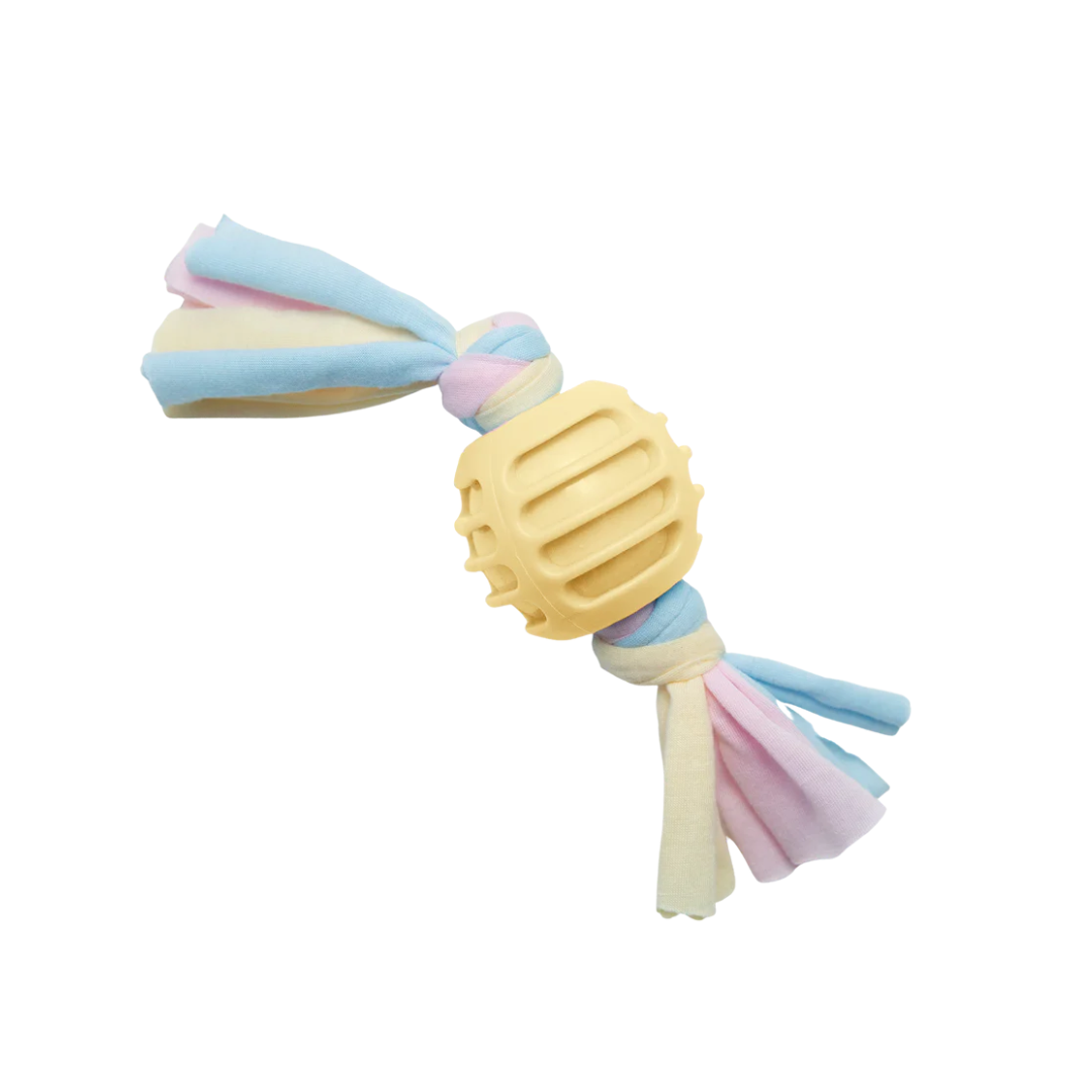These Eco friendly TPR toys are perfect for your little pup who loves to chew & play fetch. These toys have a braided cotton rope attached for additional play. Designed to aid in dental health. Perfect for the lil chewer. Made from eco friendly materials