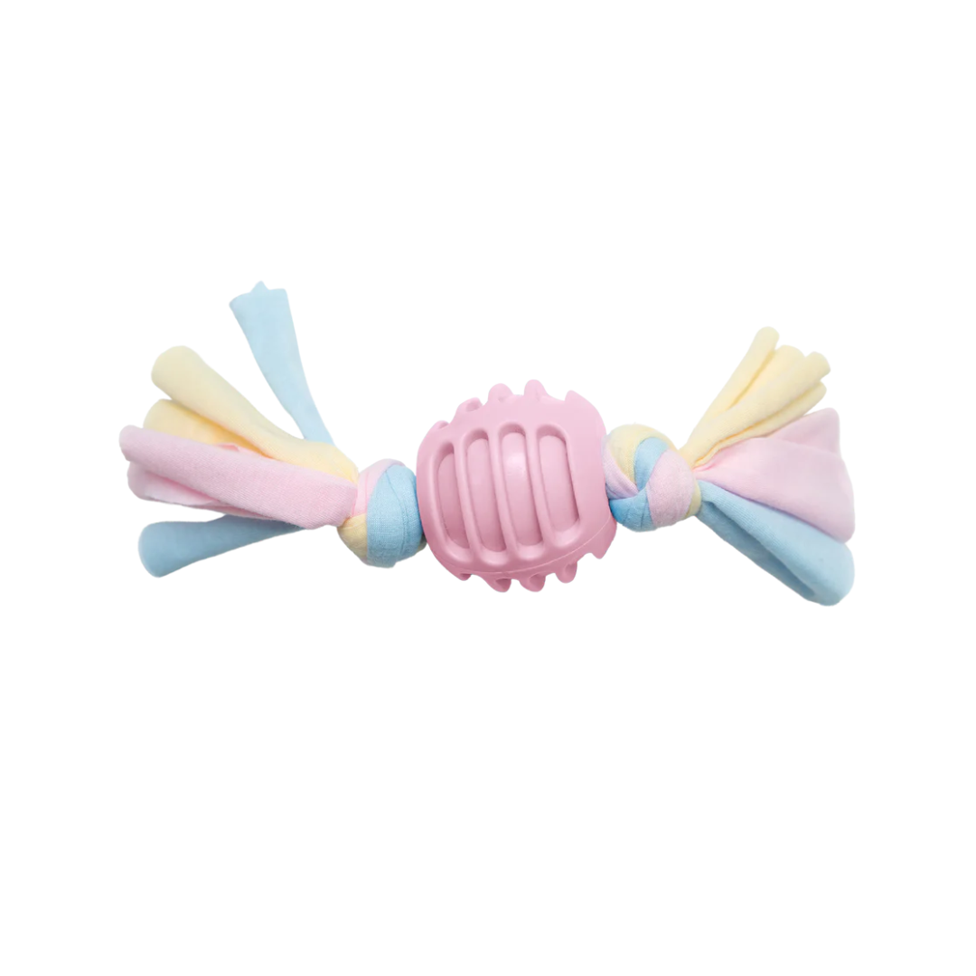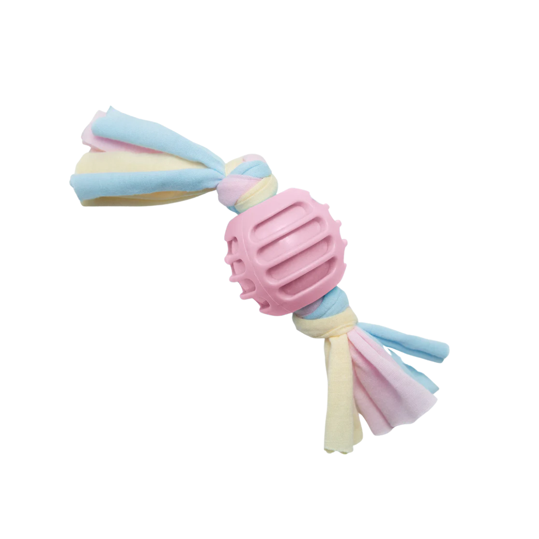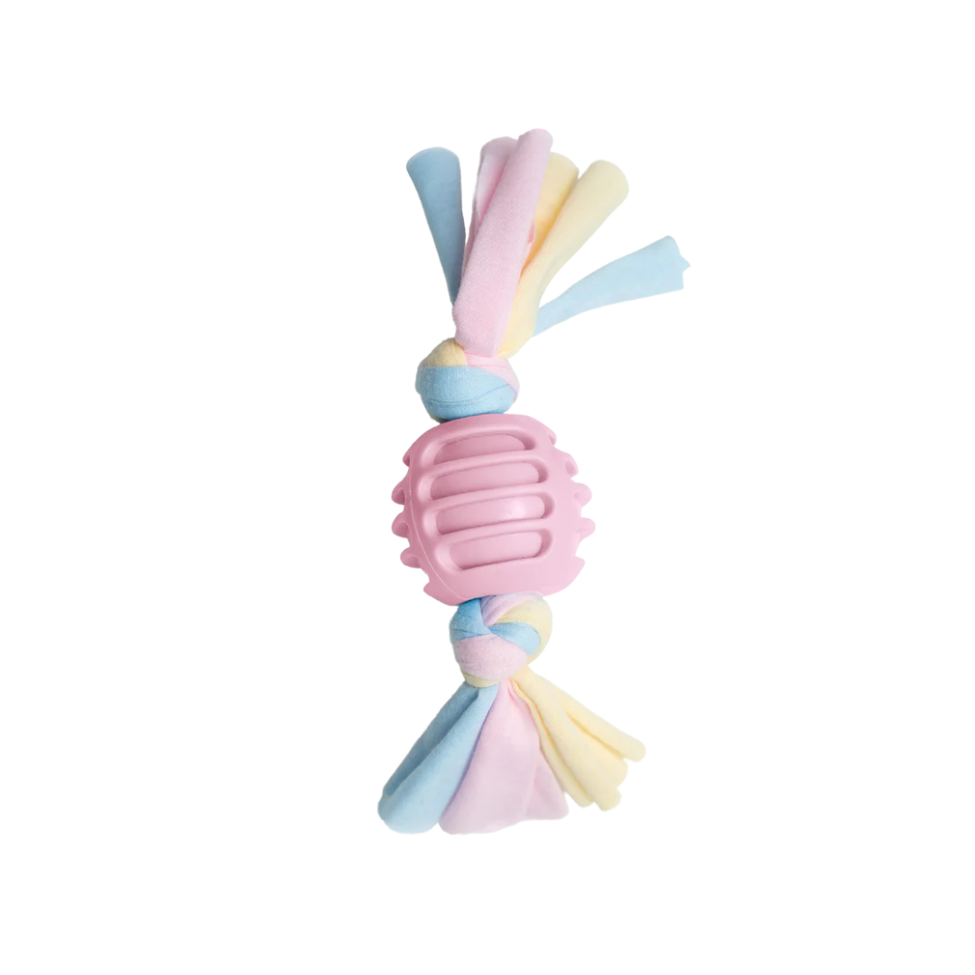 These Eco friendly TPR toys are perfect for your little pup who loves to chew & play fetch. These toys have a braided cotton rope attached for additional play. Designed to aid in dental health. Perfect for the lil chewer. Made from eco friendly materials