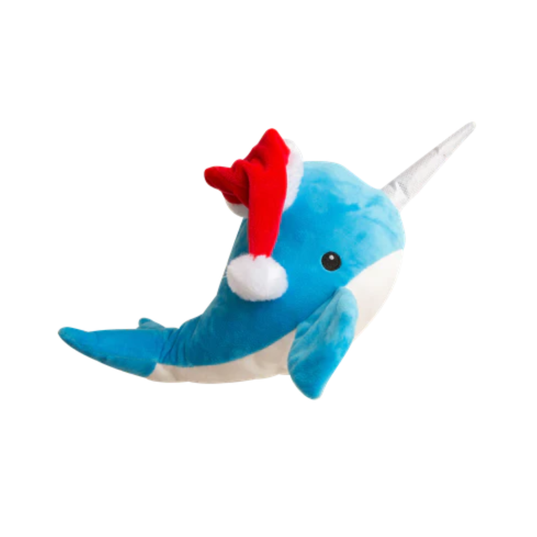 St. Nikki the Narwhal is here to bring holiday cheer to your pup. What's a Narwhal, you ask? It's a unicorn of the sea! This adorable Christmas squeaky toy features a cozy blue plush exterior, Santa hat, and soft iridescent unicorn horn. Inside, super fun squeakers and crinkle material deliver satisfying effects during playtime.